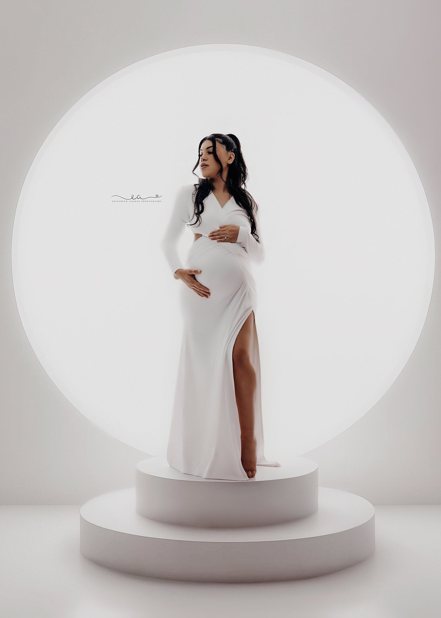 The long fitted sleeves balance the gown's striking high slit skirt, creating a refined yet bold look perfect for modern maternity portraits. A softly gathered bodice accentuates the bump, while the sleek floor- length drape elongates the figure for an effortlessly ethereal finish.