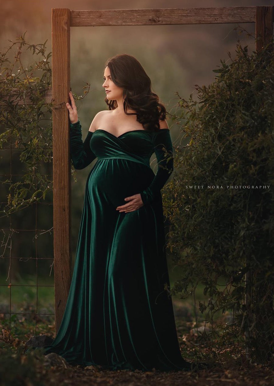 The Darah Gown features an off the shoulders cut with long sleeves and a half circle skirt with a wrap style leg slit.