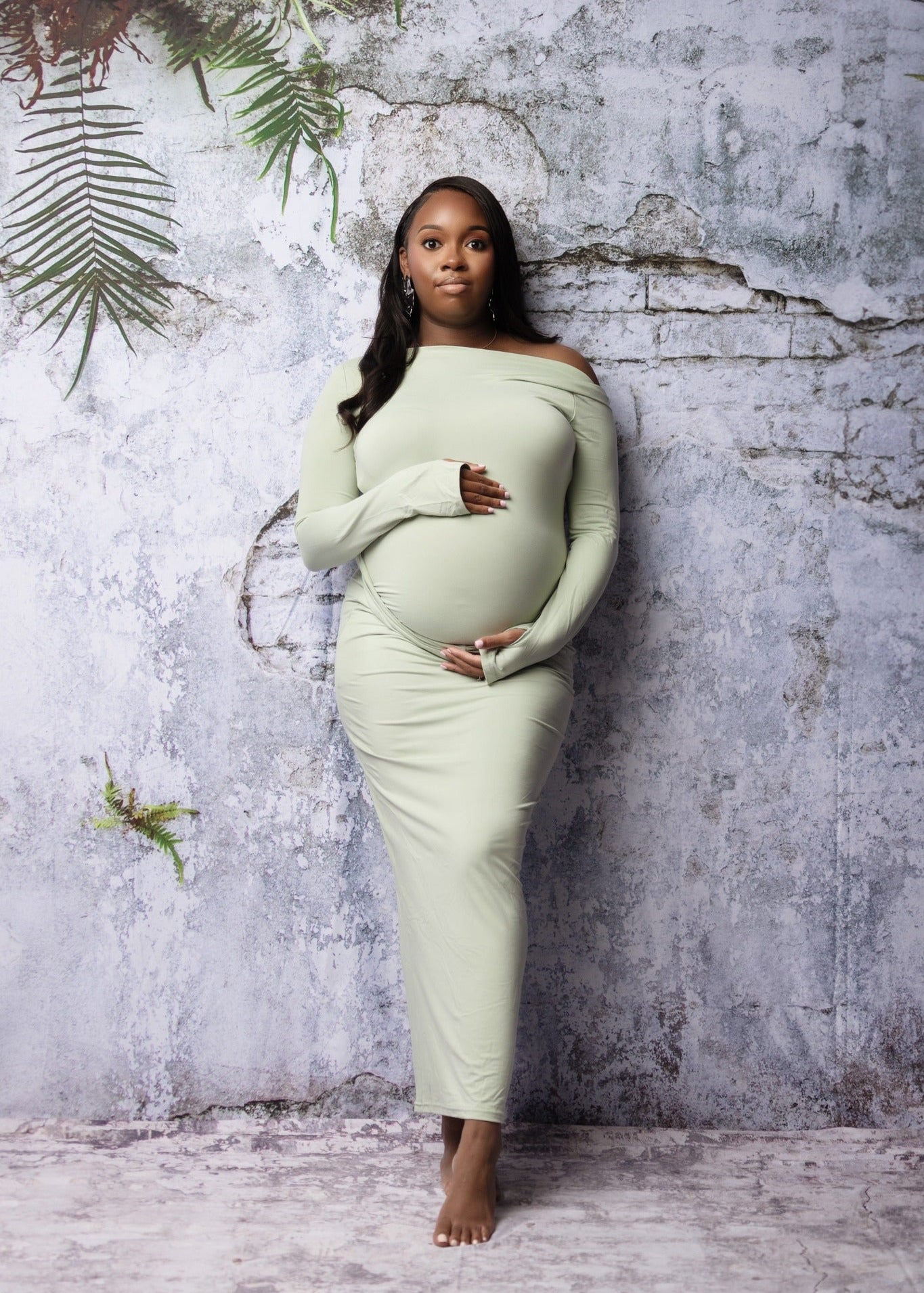 Emma Dress features long sleeves, a ruched belly detail, it's fitted and perfect for a modern, cool look.