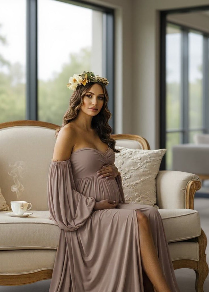 The Imani Gown features a strapless top with detachable puff sleeves and an A Line skirt with a long tossing train and leg slit.