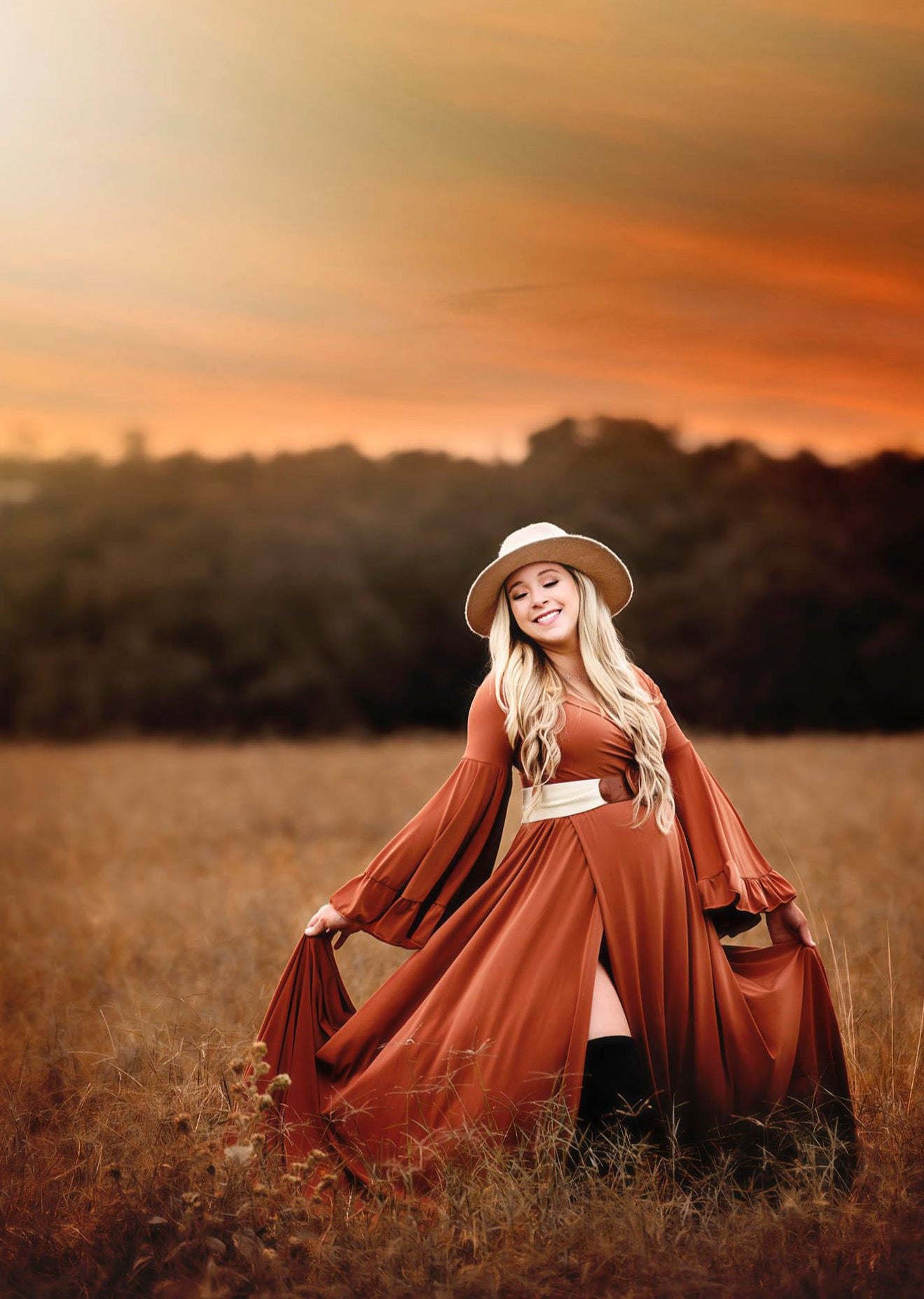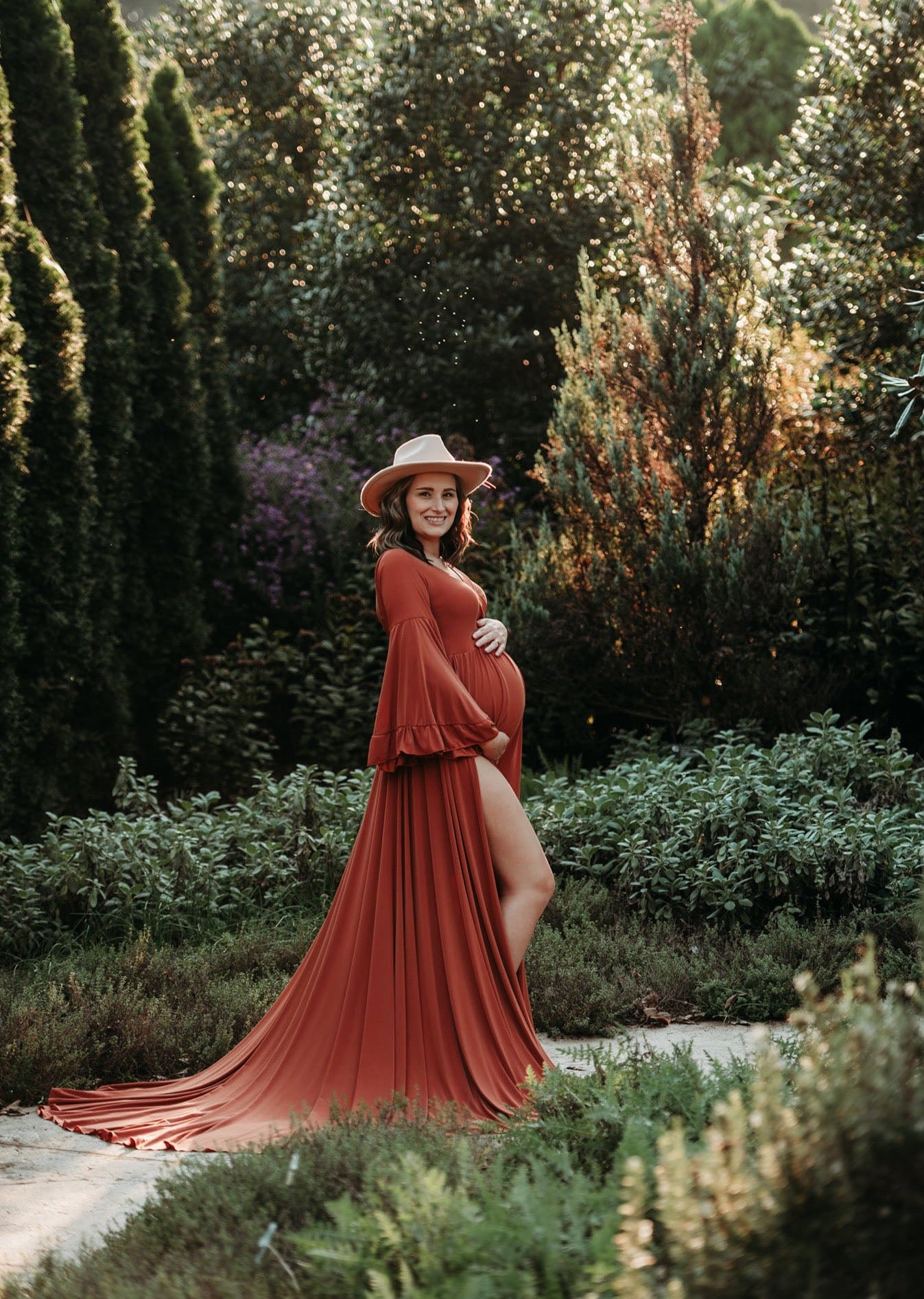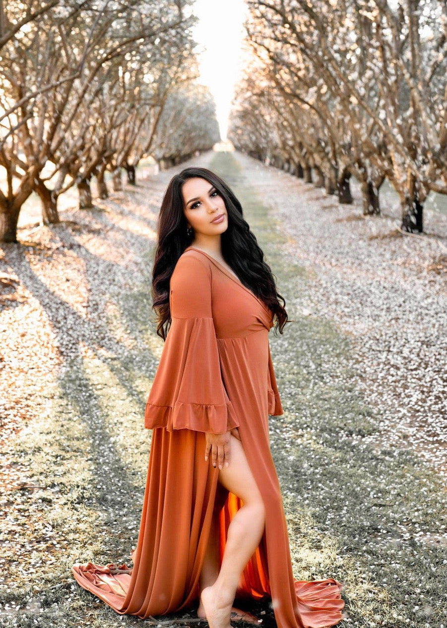 The Miranda Gown features ruffled bohemian bell sleeves and an A Line skirt with a long tossing train and leg slit.